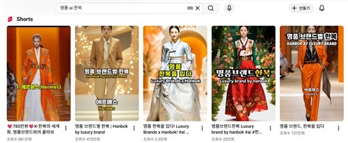 21일 현재 유튜브·틱톡 등에 '명품 AI 한복'을 검색하면 수백 개의 영상이 뜬다.