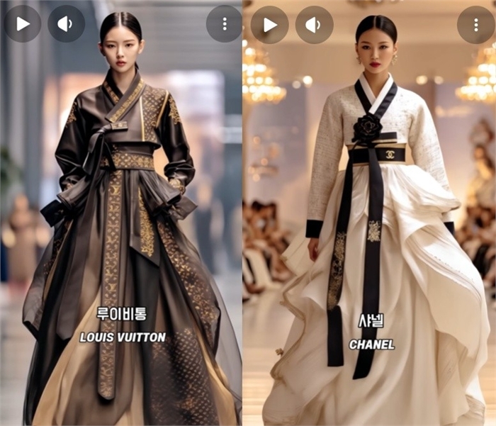 제작자가 인공지능(AI)으로 만든 결과물이라고 밝힌 이 가상의 한복들은 독특하고 화려한 디자인으로 수백만회 조회수를 기록 중이다. 이러한 '명품 AI 한복' 영상은 지난해 초 처음 등장한 후 인기리에 제작되고 있다.