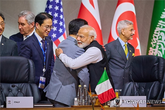 이재명 대통령, 주요 20개국(G20) 정상회의 참석 (요하네스버그=연합뉴스) 한상균 기자 = 이재명 대통령이 22일(현지시간) 남아프리카공화국 나스렉 엑스포센터에서 열린 주요 20개국(G20) 정상회의에서 나렌드라 모디 인도 총리와 인사하고 있다. 2025.11.22 [공동취재 제공. 재판매 및 DB 금지] xyz@yna.co.kr