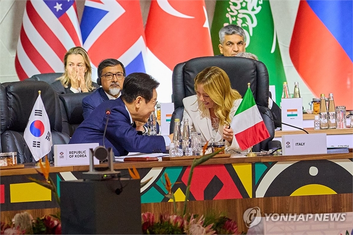 대화하는 한-이탈리아 정상 (요하네스버그=연합뉴스) 김도훈 기자 = 이재명 대통령과 조르지아 멜로니 이탈리아 총리가 23일(현지시간) 남아프리카공화국 요하네스버그 나스렉 엑스포센터에서 열린 주요 20개국(G20) 정상회의 제3세션에서 대화하고 있다. 2025.11.23 [공동취재 제공. 재판매 및 DB 금지] superdoo82@yna.co.kr