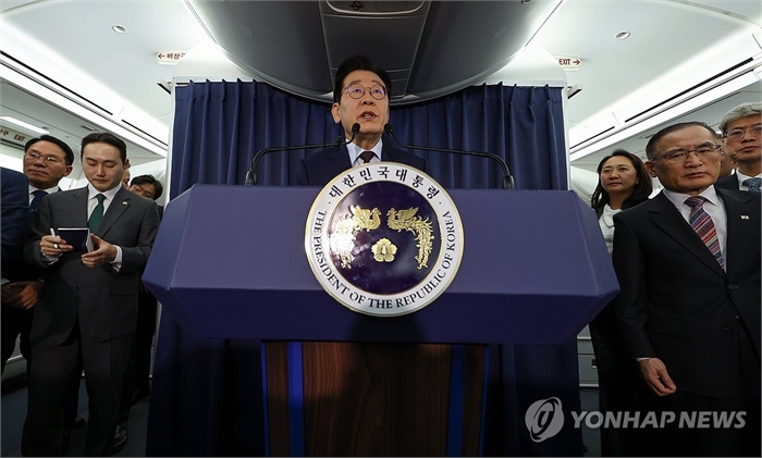 이재명 대통령, 순방 기내 기자간담회 (앙카라=연합뉴스) 김도훈 기자 = 이재명 대통령이 23일(현지시간) G20 정상회의 일정을 마치고 남아프리카공화국에서 다음 방문지인 튀르키예로 향하는 공군 1호기에서 순방 기내 기자간담회를 하고 있다. 2025.11.24 superdoo82@yna.co.kr