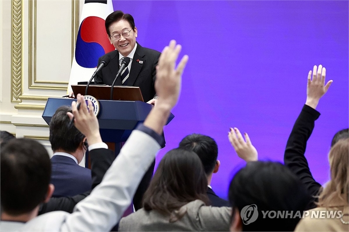 이 대통령은 성명 발표 뒤 30분간 질의응답 시간을 가졌다. 대통령실은 당초 2∼3개 질문만 받을 예정이었으나 이 대통령이 "더 하시라"고 즉석에서 허용해 총 10개의 질문을 받았다.